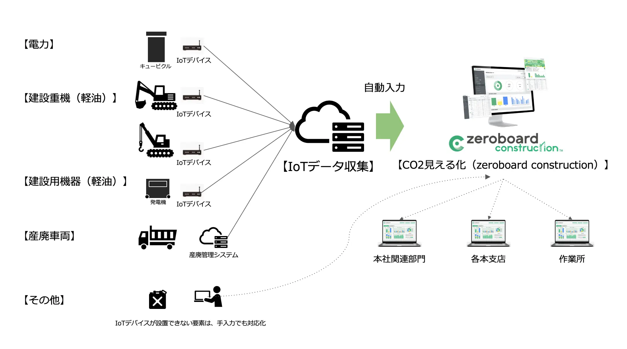 このたびの取り組みでは、IoTデバイスおよびデータ収集プラットフォームと「zeroboard construction」のデータ連携により、建設現場全体のGHG排出量を日次単位で効率的な算定・可視化、管理が可能となります。